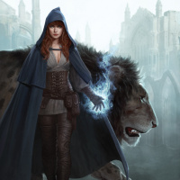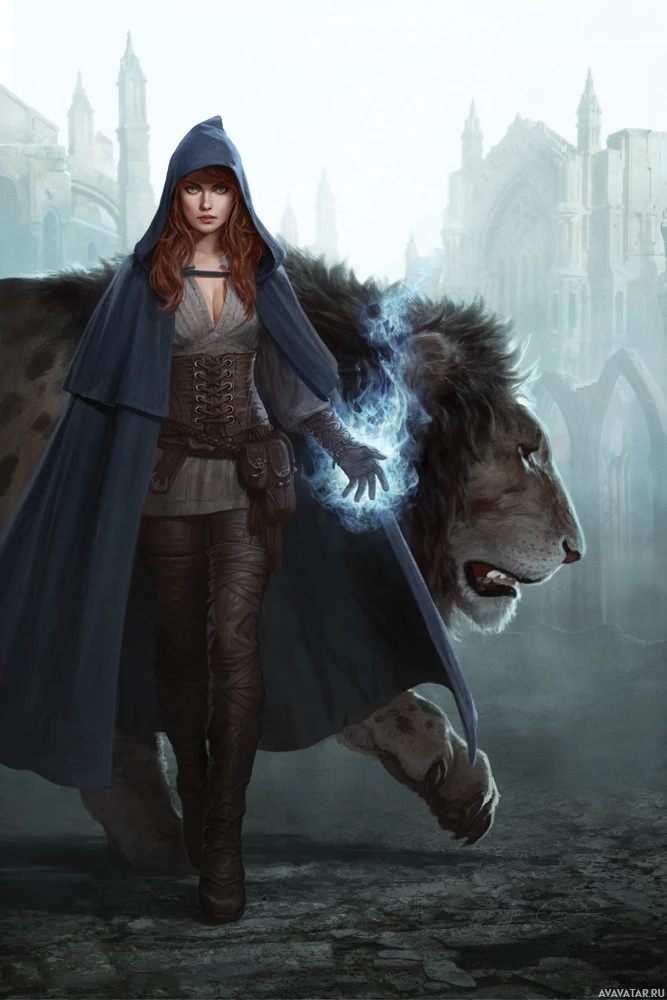 magical ability, as evidenced by the lion at her feet that is not real but appears to be under her control. The setting looks like it could be a dark and