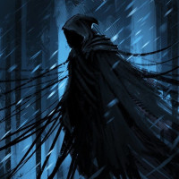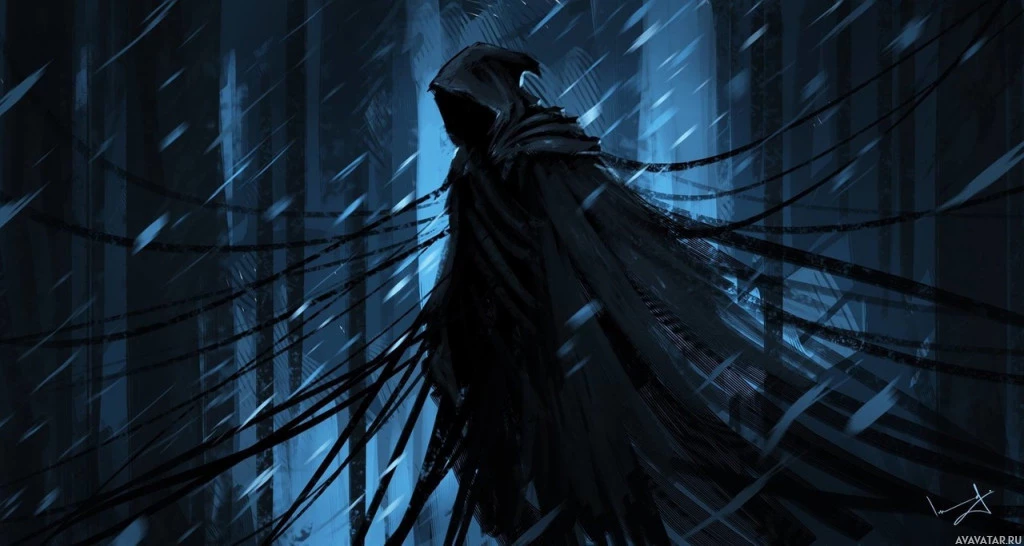 dark attire, possibly armor, with a hood covering the head. They are standing amidst what looks like stormy weather, given the rain-soaked environment and