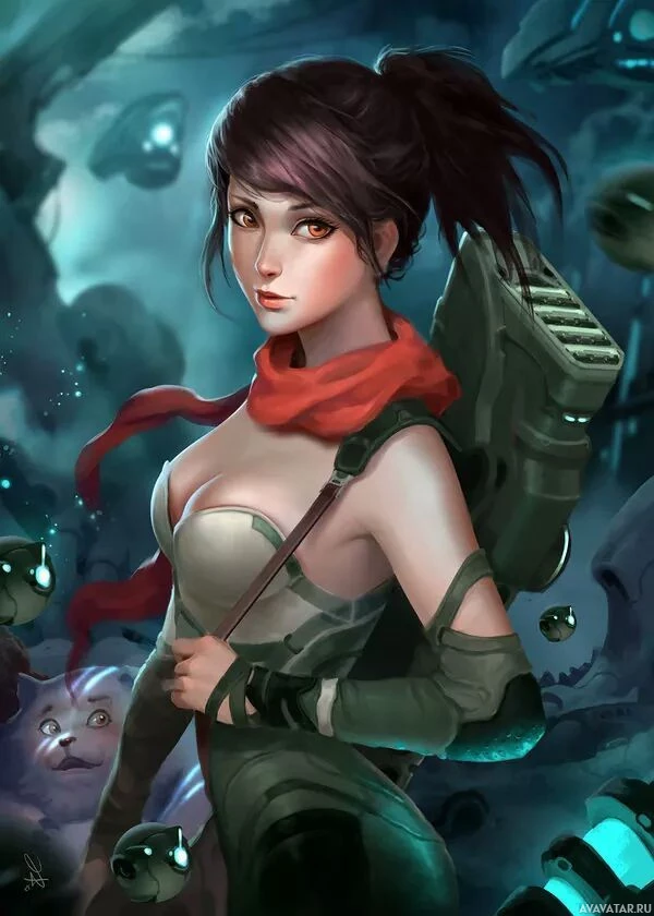 a red scarf around her neck and has a determined expression on her face. Her hair is styled in