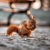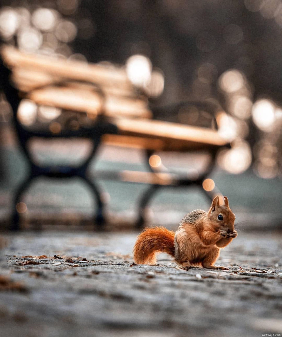 На этом снимке есть маленькая белка, сидящая на асфальтированной поверхности. Белка, кажется, смотрит в камеру и, возможно, что-то ест. На заднем плане видна скамейка в парке, что говорит о том, что эта фотография была сделана в общественном парке или аналогичном открытом пространстве.