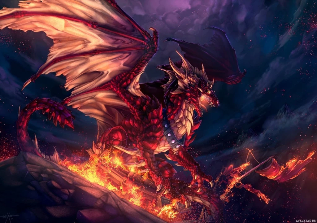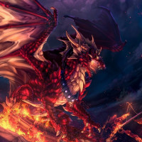 The image depicts a fantasy-themed artwork of a dragon. It's characterized by red and yellow scales,
