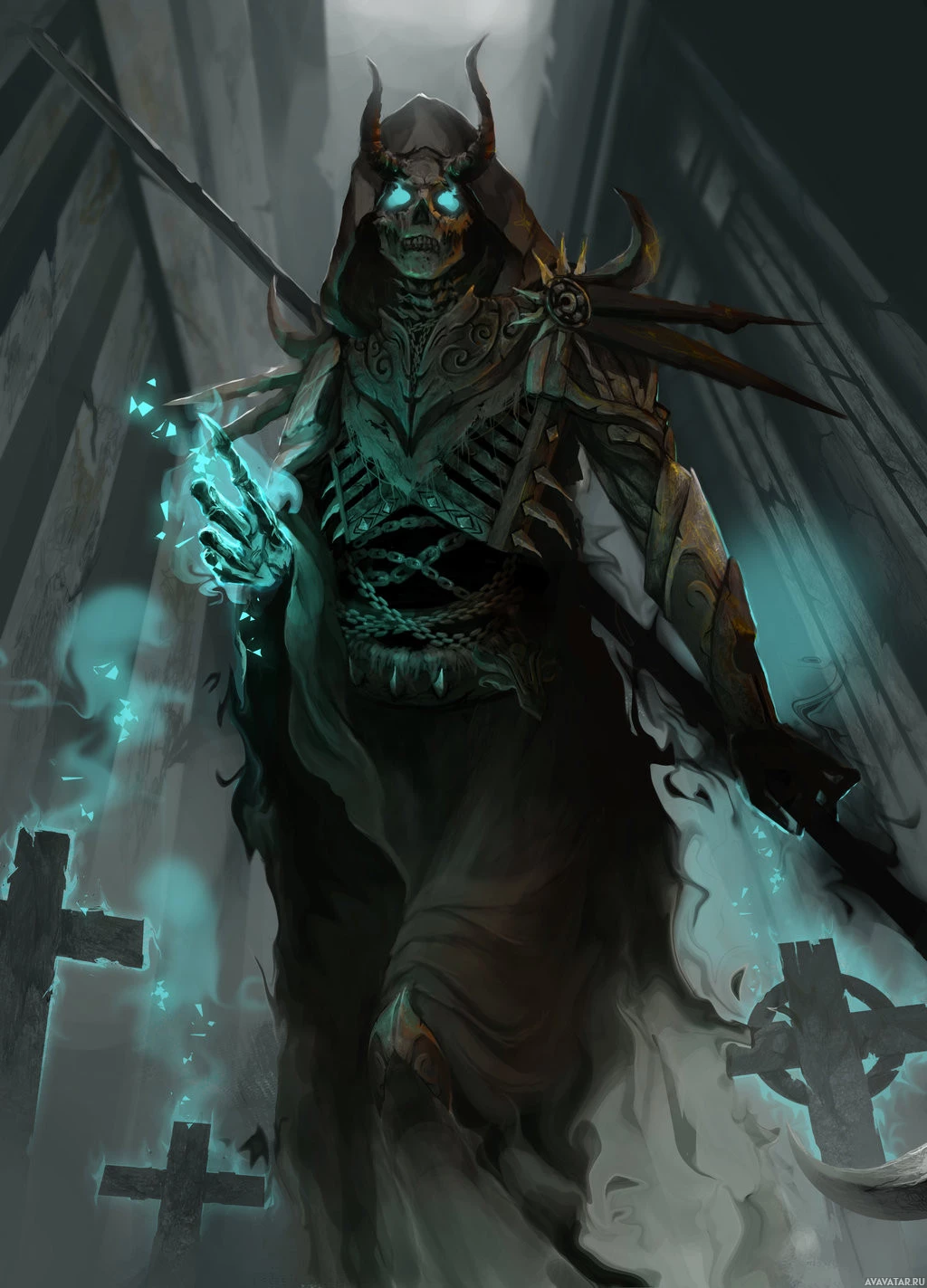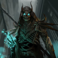 glowing eyes, suggesting they might be a magical entity such as a necromancer or an undead creature. They are holding what appears to be