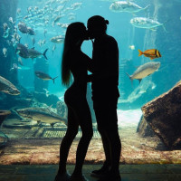 an underwater view from an aquarium or a similar attraction. They are both looking towards the camera and seem to be kissing on the cheek. In the background, various