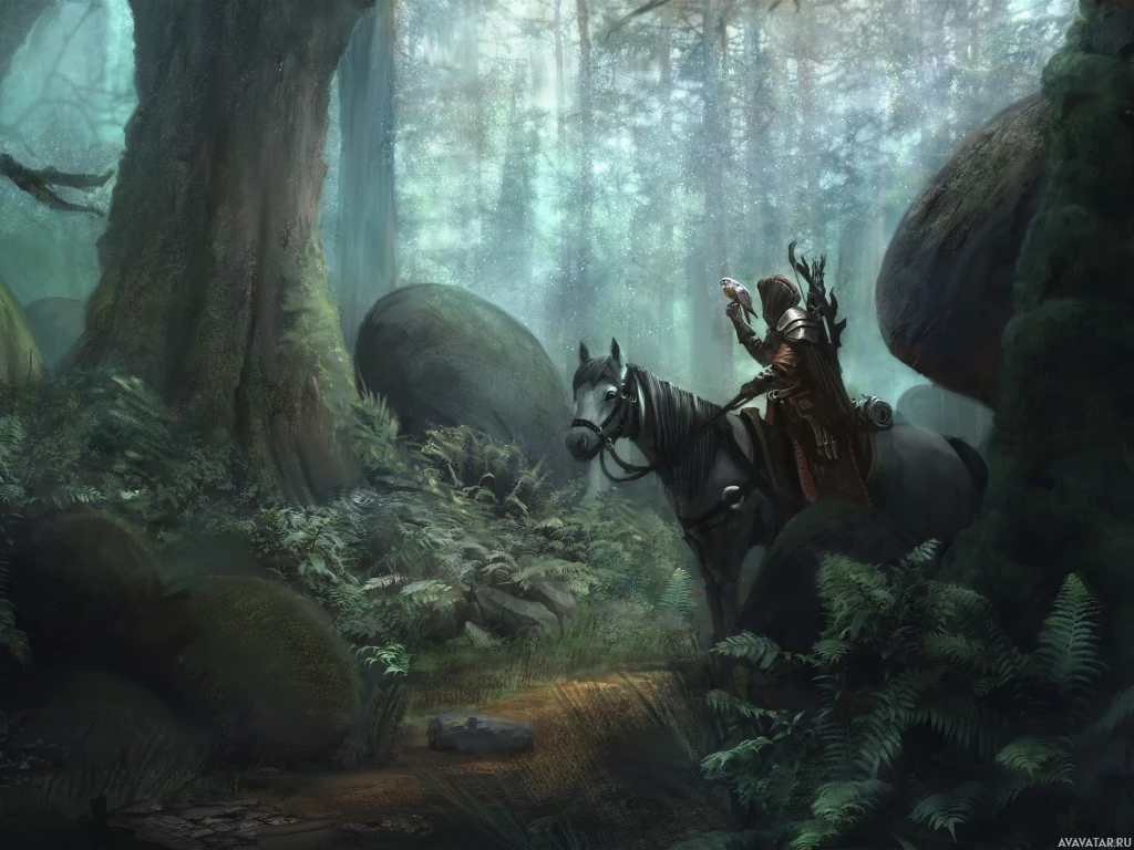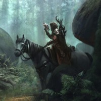 a forest setting. The rider appears to be wearing medieval or fantasy-style clothing and is holding out their hand towards the viewer, possibly waving or greeting them. The background is filled with
