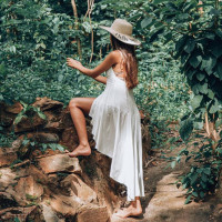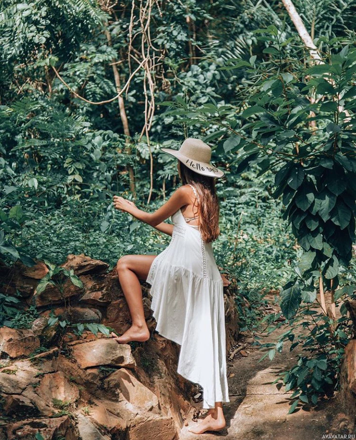 The picture shows a person from behind, wearing a dress and a hat. They appear to be in a natural environment with vegetation, possibly a forest or jungle setting, given the presence of green foliage and rocky terrain.