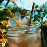 The image shows a glass of iced tea or lemonade, adorned with a small flower on the rim. It appears to be a refreshing drink, possibly served during a sunny day or in a tropical setting, given the palm trees and clear blue sky in the background.