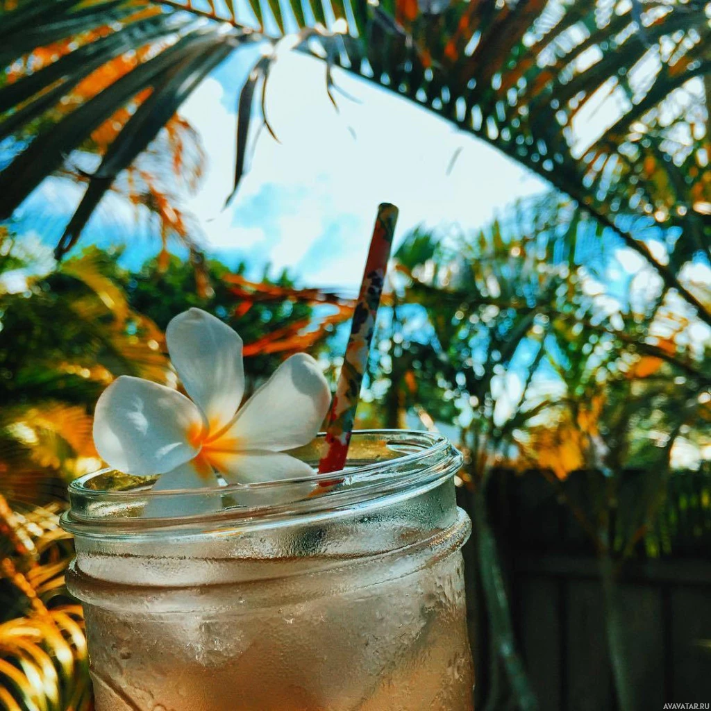 На снимке показан стакан чая со льдом или лимонад, украшенный небольшим цветком на ободе. Это освежающий напиток, который, возможно, подается в солнечный день или в тропической обстановке, учитывая пальмы и чистое голубое небо на заднем плане.