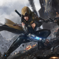a female warrior or archer. She is wearing a hood and holding a bow. Her pose suggests she is either in the middle of