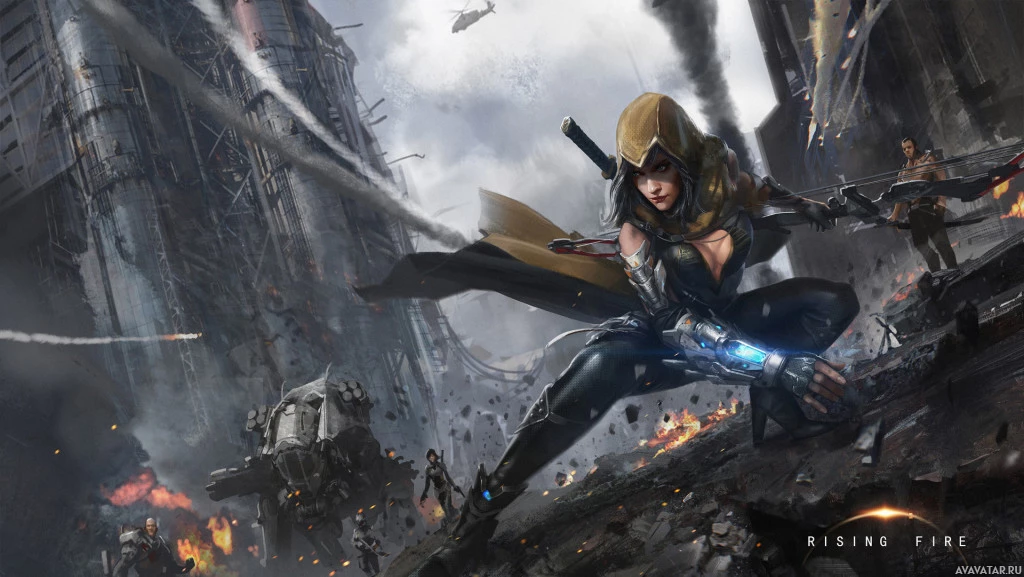 an action scene or preparing for one. There are explosions and destruction around her, indicating that she may be in a battle or