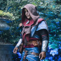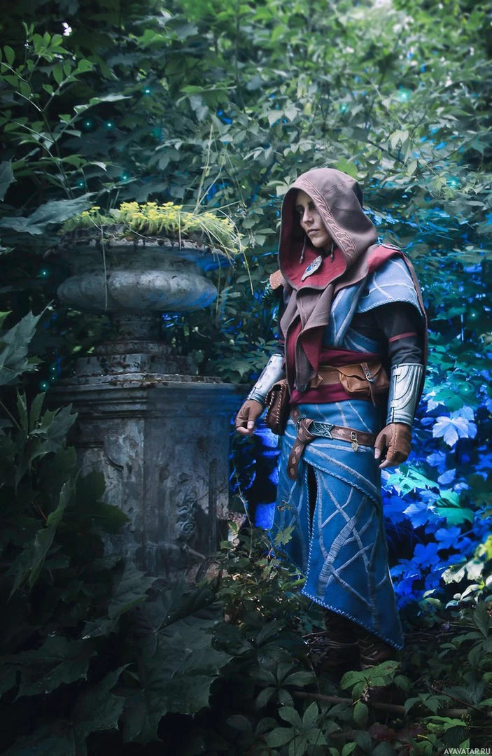 На картинке вы видите человека, одетого как персонаж из видеоигры «Ведьмак 3: Дикая Охота». Этот косплей изображает персонажа-эльфа, носящего синюю и серебряную броню с капюшоном, что соответствует внутриигровому дизайну эльфийской одежды. Сцена кажется пышным зеленым лесом или лесной зоной, добавляя к фантастической атмосфере сцены.