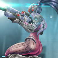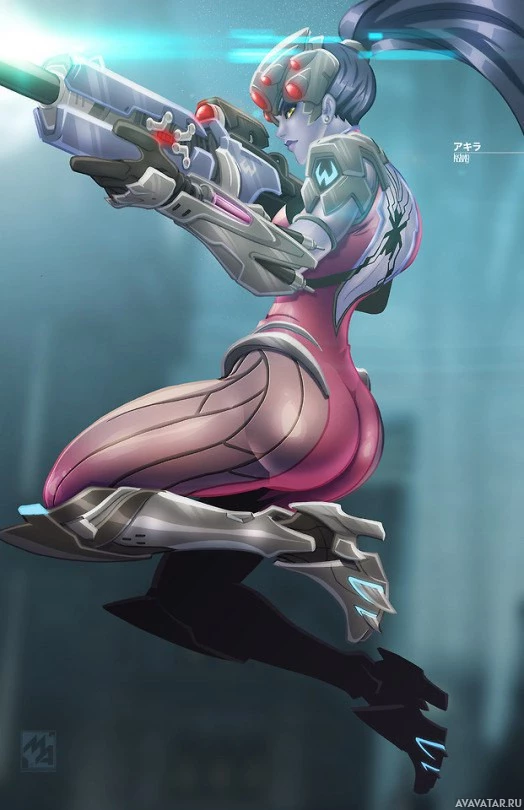 a dynamic pose that suggests she might be in the midst of a high-action scenario. Her outfit is sleek and futuristic, fitting with the overall aesthetic of "Overwatch."