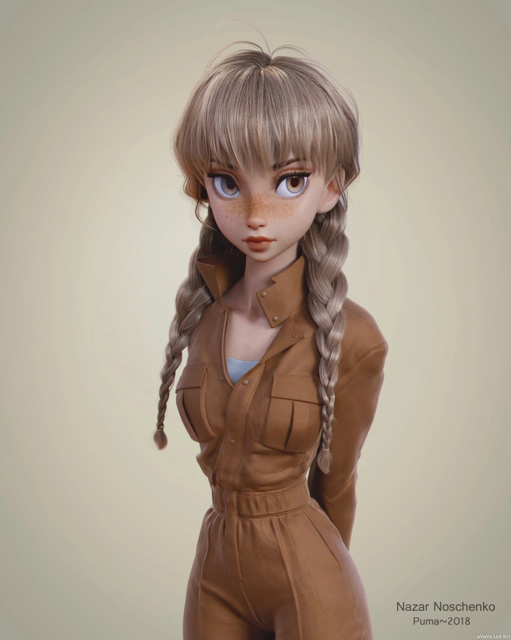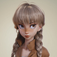 blonde hair tied into braids and is wearing a tan jumpsuit with a zipper up the front. Her expression is neutral to slightly concerned. There is text overlaying the image that reads "PUBLIC ARTIST," suggesting the artist's name or pseudonym.