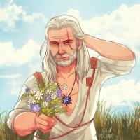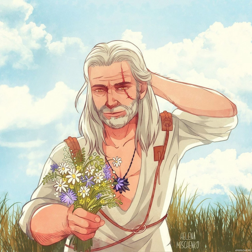 Geralt of Rivia, a character from the game "The Witcher" series. He is depicted with a beard and mustache, holding