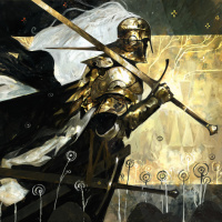 a dynamic pose, suggesting movement or action. The style of the artwork includes a blend of realistic elements like the armor and sword, along with more abstract or stylized elements in the background, which gives it a dramatic and epic feel. There are also other figures in the background that appear to be part of