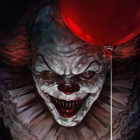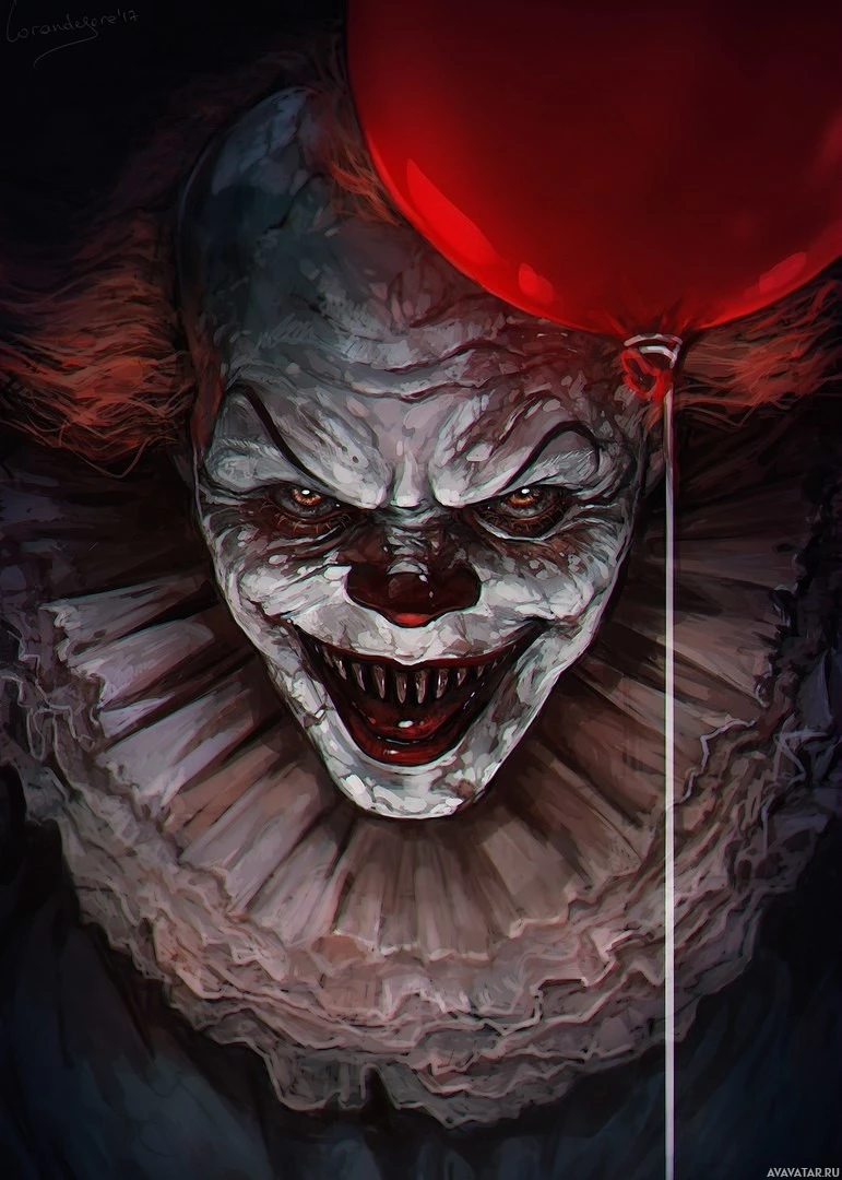 a red balloon, which could symbolize danger or an eventuality that brings about terror in a horror story context. The clown's expression and demeanor are designed to evoke