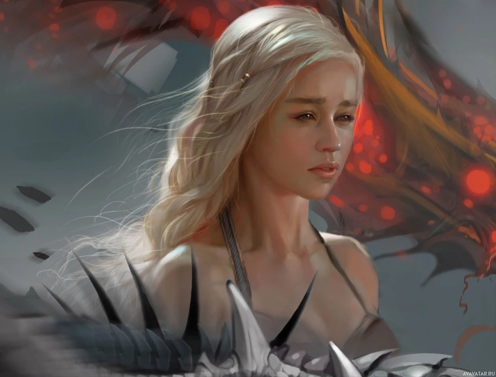 Daenerys Targaryen from the television series "Game of Thrones." She is portrayed in her iconic form, with platinum