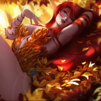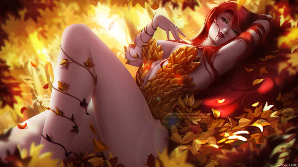 red hair lying on her back amongst fallen autumn leaves. She appears to be in a relaxed or peaceful state, possibly enjoying
