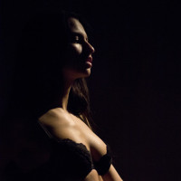 dim lighting, and only part of their body is visible; from about mid-thigh up. Their pose suggests they might be stretching or performing an exercise that involves flexibility. It's important to respect privacy and avoid making assumptions based on the image.