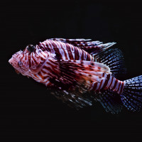 The image shows a colorful fish swimming underwater. It appears to be a red scorpionfish (also known as a coral reef fish), characterized by its vibrant colors and unique body shape. The fish is surrounded by water, indicating that it is in an aquatic environment, likely the ocean or a sea.