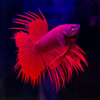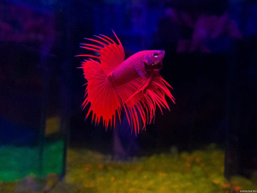 На картинке изображена рыба с красными плавниками и телом, широко известная как рыба Бетта. Похоже, что он плавает в аквариуме с водой, которая имеет фиолетовый оттенок и некоторые зеленые растения внизу.
