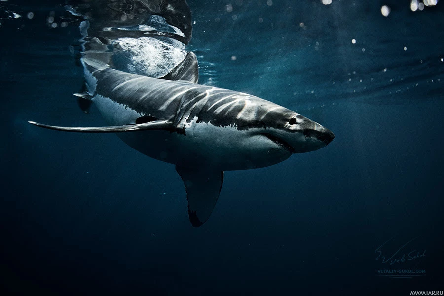 white shark, as indicated by its distinctive body pattern and fin shape. The water has bubbles that suggest movement or breathing activity. It's important to note that while this image includes an animal (the shark) and is related to fish (since sharks are fish), the term "fish" in this context could be considered a generalization since it specifically refers to sharks, which are not typically thought of as "fish" due to their