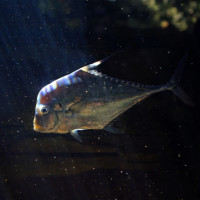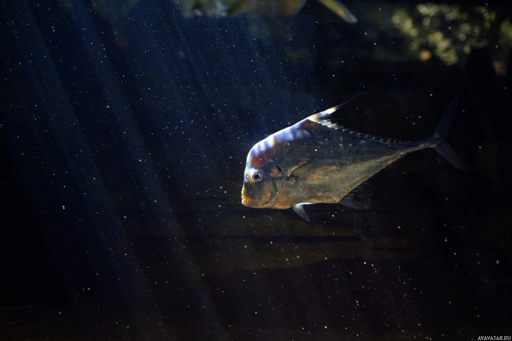 The image depicts a fish swimming underwater in what appears to be sunlight filtering through the water. The fish has