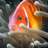 На снимке изображена рыба-клоун, заглядывающая сквозь щупальца анемона. Рыбы-клоуны известны своими яркими цветами и часто встречаются в тесной связи с морскими анемонами, которые обеспечивают как пищу, так и защиту от хищников. Этот тип симбиотических отношений обычно наблюдается в коралловых рифах океана.