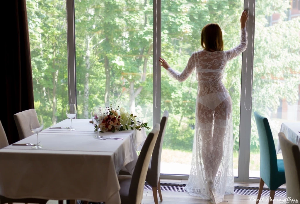 an elegant attire that could be considered lingerie or bridal wear due to the sheer and lacy material. In the background, there appears to be