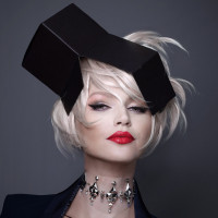 a unique hairstyle that includes what appears to be a piece of black material or a hat that covers part of her face. The model is wearing