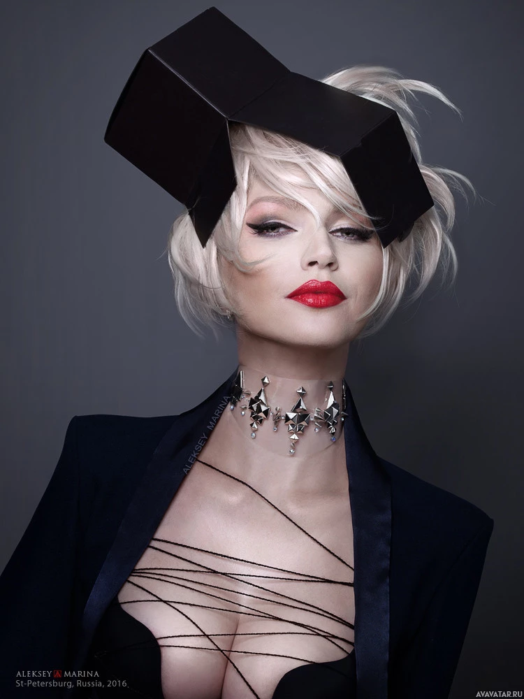 blonde hair and is styled with bold makeup, including prominent red lips. Her head is adorned with