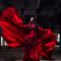 red dress that flows out behind them, creating a dramatic silhouette. The background consists of