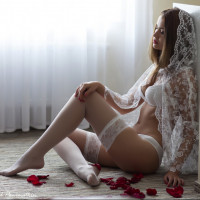 The image features a woman sitting on the floor, leaning against a wall. She is wearing lingerie and stockings. Her legs are crossed, and she has her eyes closed as if she is in
