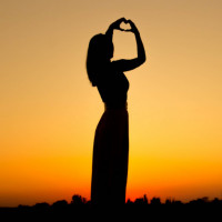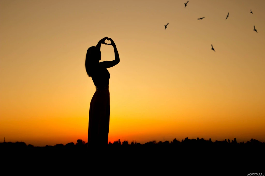 На картинке изображен силуэт девушки на закате. Она стоит с поднятыми над головой руками, образуя то, что кажется формой сердца на небе. Вокруг нее летают и птицы. Фон показывает цвета и свет, обычно связанные с рассветом или сумерками.