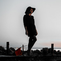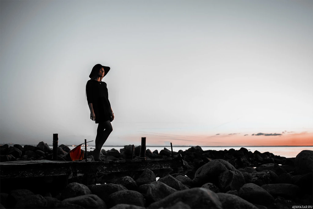 a dark outfit and a hat that matches their attire. The