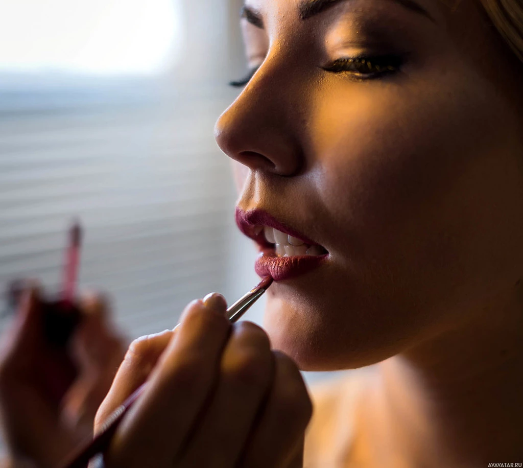 the lipstick application. The setting appears to be indoors with artificial lighting, casting