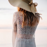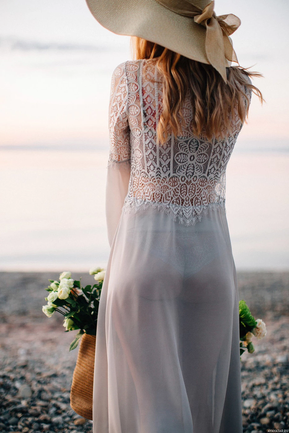 long hair and are holding flowers in their hands, suggesting they might be participating in an event such as a wedding or ceremony. There is no visible hat on them. The setting appears to be a beach during either sunrise or sunset, given