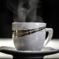 The image features a cup of coffee or tea with visible steam rising from the liquid inside, which suggests that it is freshly brewed. The cup has a modern design with a gold or yellow-toned band around its base, possibly indicating a brand or simply adding decorative detail to the mug. It's placed on what appears to be a saucer with a matching color scheme, giving an elegant presentation.