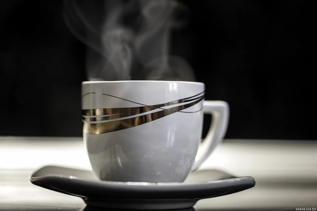 На картинке изображена чашка кофе или чая с видимым паром, поднимающимся из жидкости внутри, что говорит о том, что он свежесварен. Кубок имеет современный дизайн с золотой или желтой полосой вокруг основания, возможно, с указанием бренда или просто добавлением декоративных деталей кружки. Он помещен на блюдце с соответствующей цветовой схемой, давая элегантную презентацию.
