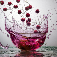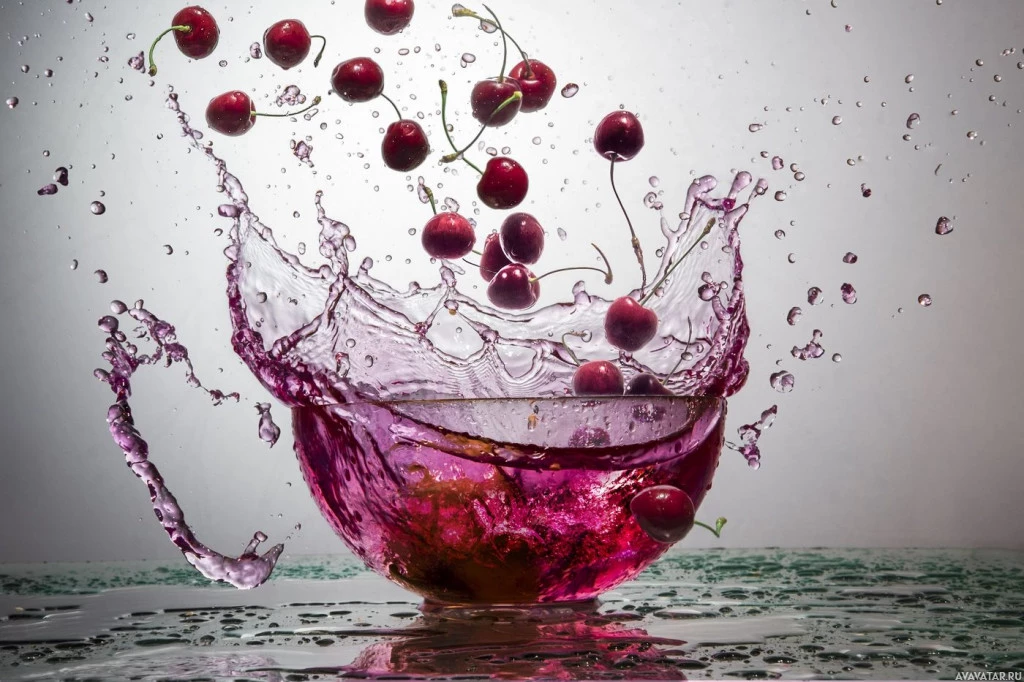 a fizzy drink. The cherries are not only floating on top but also seem to be in motion due to the forceful action of the effervescence. This creates a visually striking scene with