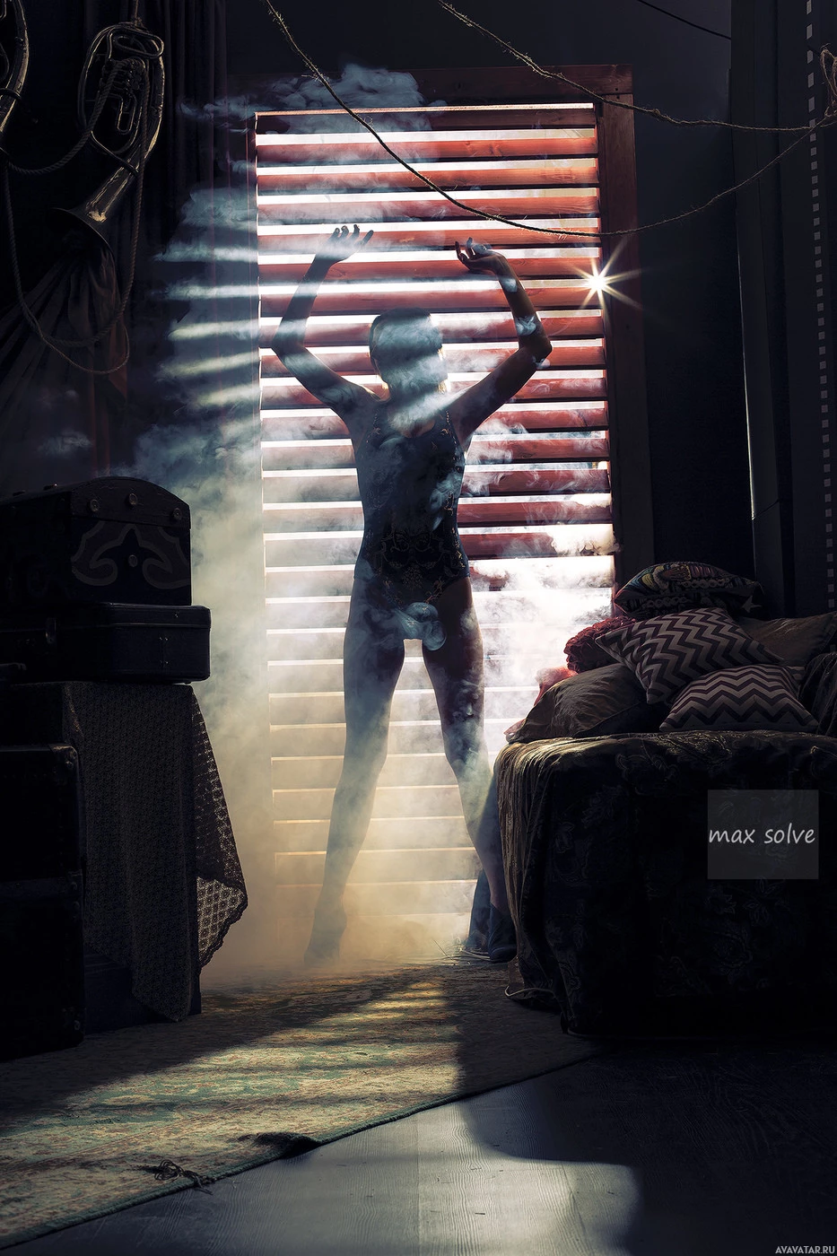 a patterned carpet in front of a bedroom door with blinds partially drawn. Behind the silhouette, there is smoke billowing upward, adding