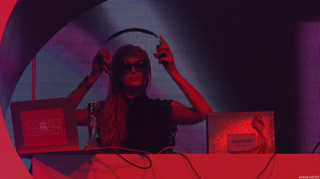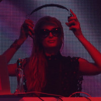 a DJ booth, which appears to be set up for a performance or event. She is wearing sunglasses and headphones, suggesting she might be preparing to perform as a DJ or is already in the midst of doing so. In front of her on the booth are various items that may be related to her work, including what seems to be a book, possibly a track list or