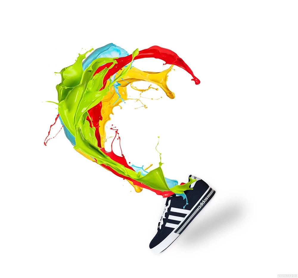 splash of color, there is a single sneaker positioned in such a way that it seems to interact with the paint splatter. The sneaker has a white upper and black laces, characteristic of the Adidas brand's