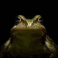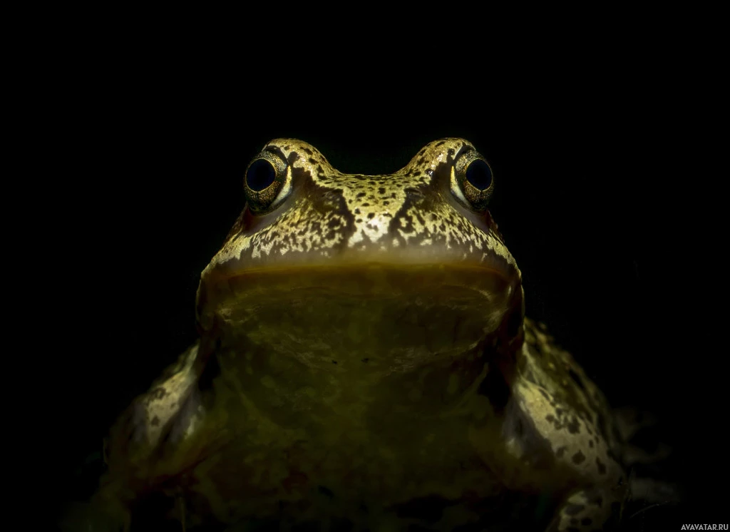 На снимке изображена лягушка с большими широко раскрытыми глазами, смотрящими прямо в камеру. На снимке, сделанном крупным планом, видны детали и выражение ее лица. Темный фон контрастирует со светлой окраской лягушки.