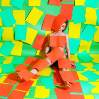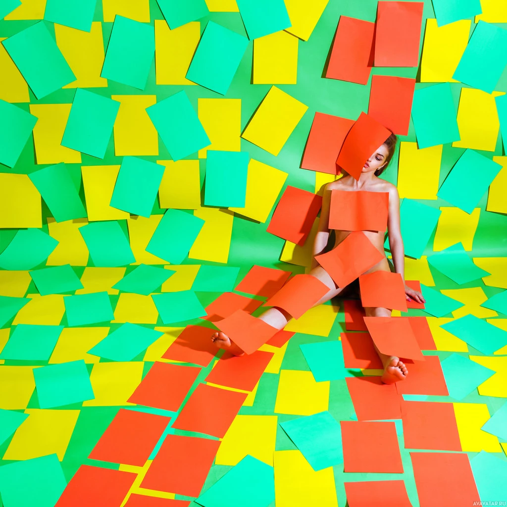body paint or makeup that matches some of the paper's colors, which creates an interesting visual contrast. She seems to be posing for the picture with