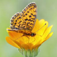 The image depicts a small butterfly, specifically a peacock butterfly (Aglais io), perched on the petals of an orange flower. This is a close-up shot with a focus on the insect and its interaction with the plant's blossom.