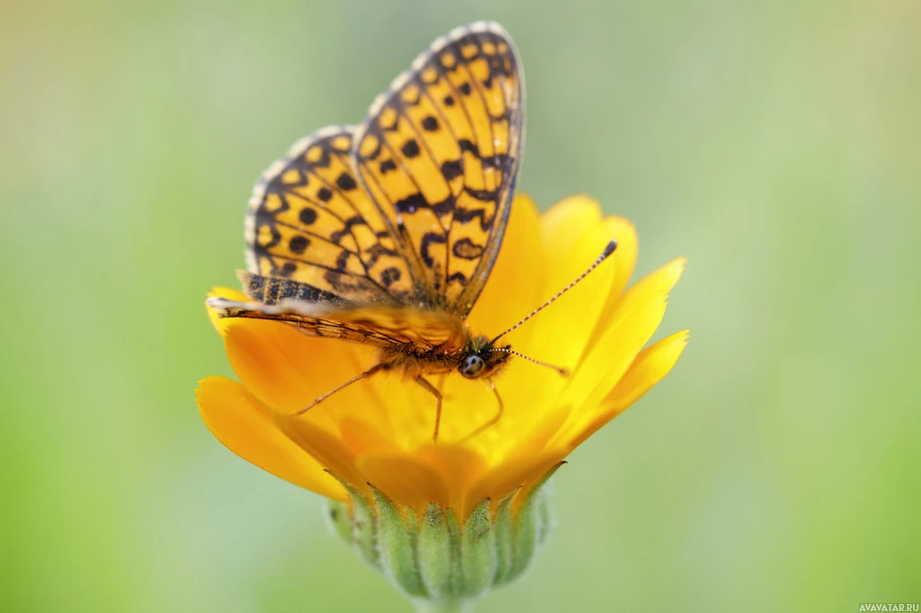 На картинке изображена маленькая бабочка, в частности павлиновая бабочка (Aglais io), расположенная на лепестках оранжевого цветка. Это крупный план с акцентом на насекомое и его взаимодействие с цветком растения.