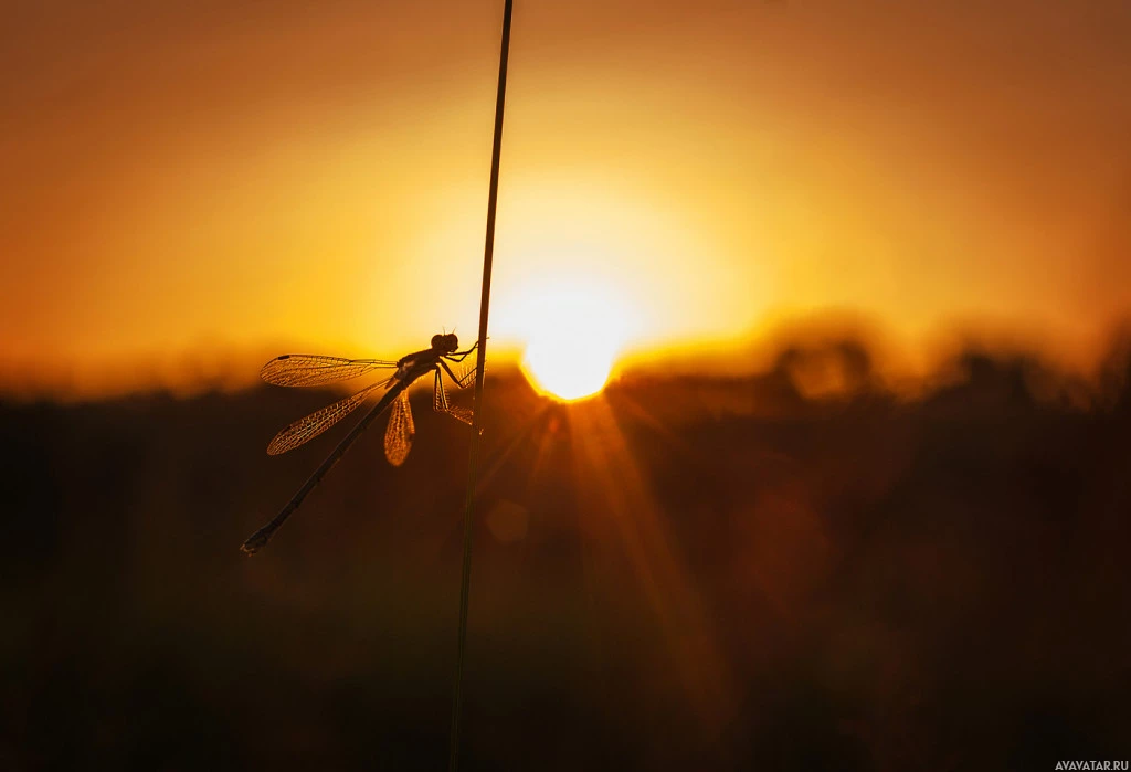 a setting sun, which creates warm colors and silhouettes. The dragonfly's wings are extended slightly, indicating that it may have just landed or is preparing to take off. The overall atmosphere of the image conveys