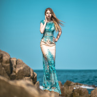 blonde hair and is wearing a sleeveless dress with a mermaid silhouette, giving it a shimmering look as if it's made from scales. The dress features