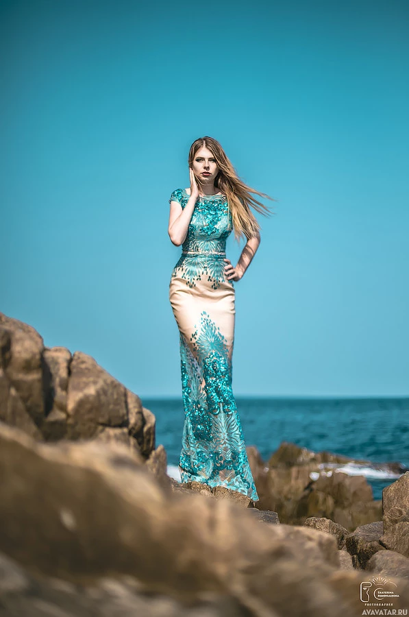 a body of water, which could be either an ocean or a sea. She has long