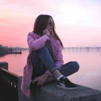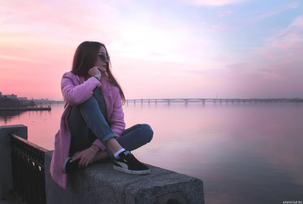 a pink jacket over her jeans, suggesting it might be cooler outside. The background features the sky with hues that indicate either sunrise or sunset, and there are structures that could be part of a bridge or pier extending into the water. The overall atmosphere of the picture is serene and contemplative.